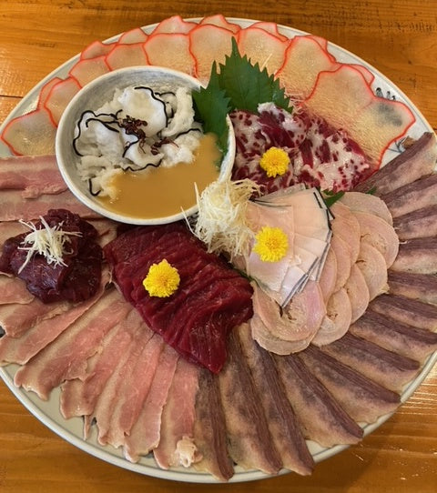 「大きな幸せを願い赤肉を食す、どでかい生命の象徴の鯨の心臓を喰らい、白雪に梅の花が散りばめた鹿の子を高貴に食し、末広がりの畝須ベーコン、世界一長い小腸と畳百畳もある鯨の胃袋で家族を包み、深海でも600海里(1000キロメートル)届く雄叫びで願いを込めてさえずりを喰らい、心や志を大きく持ち、おばけを食し、本皮を食しながら新春を迎える」。
