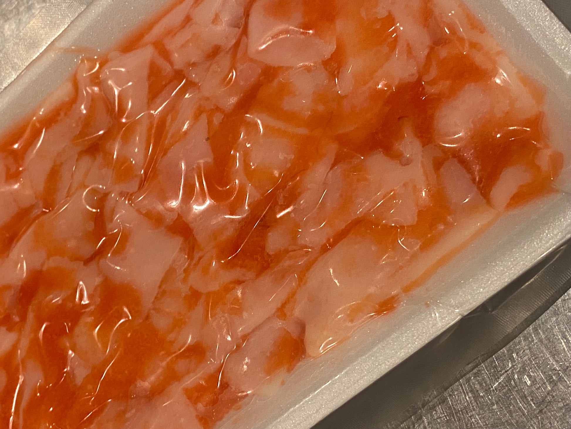 鯨の本皮を食べやすく薄く細目にスライスして明太子と会えた商品になります。